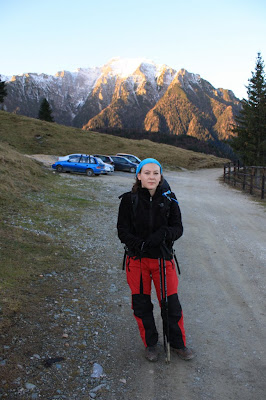 La ora 7.40 a.m (ne-am trezit mai tarziu decat planuisem, dar, de, se doarme bine la munte) am pornit alene in directia Pichetului Rosu. Cerul era de dimineata foarte senin si de la fereastra camerei noastre se vedea magnific o parte a masivului Bucegi.